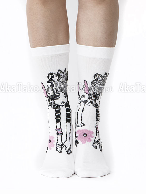 One pair of unique socks featuring Aquirax Uno's design of a girl, a cat, and a flower waiting to stretch around your foot. Black and white with pink accents. Socks are made in Osaka, Japan, by the Higuchi Knitting Company as part of the CREATION Project 2017.