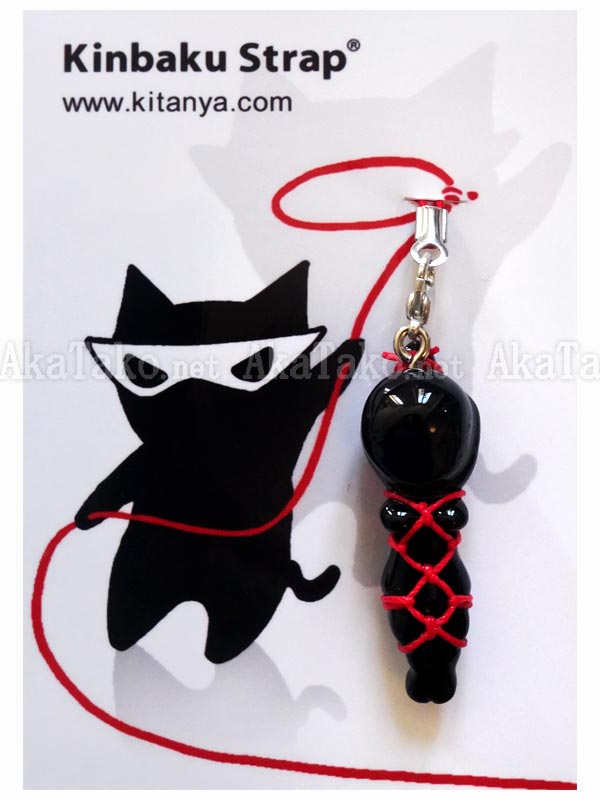 A lady lover of latex is covered in head to toe with black "latex" and is tied up in Japanese rope bondage. She is suspended by her hands in back of her head. Kinbaku cell phone strap handmade in Japan and signed by the artist (in red on back). Comes on a paper display card as shown in second photo and has a lobster claw clasp to make attachment easier.