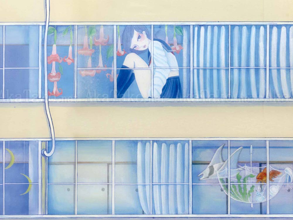 Original painting by Chika Yamada of three floors of a building. Peeking through windows we see an industrial smoke stack, a school girl hiding in lily flowers, phases of the moon, a flying manta ray, a goldfish swiming in a clear umbrella, laundry drying, industrial pipes, and a school girl looking out the window.