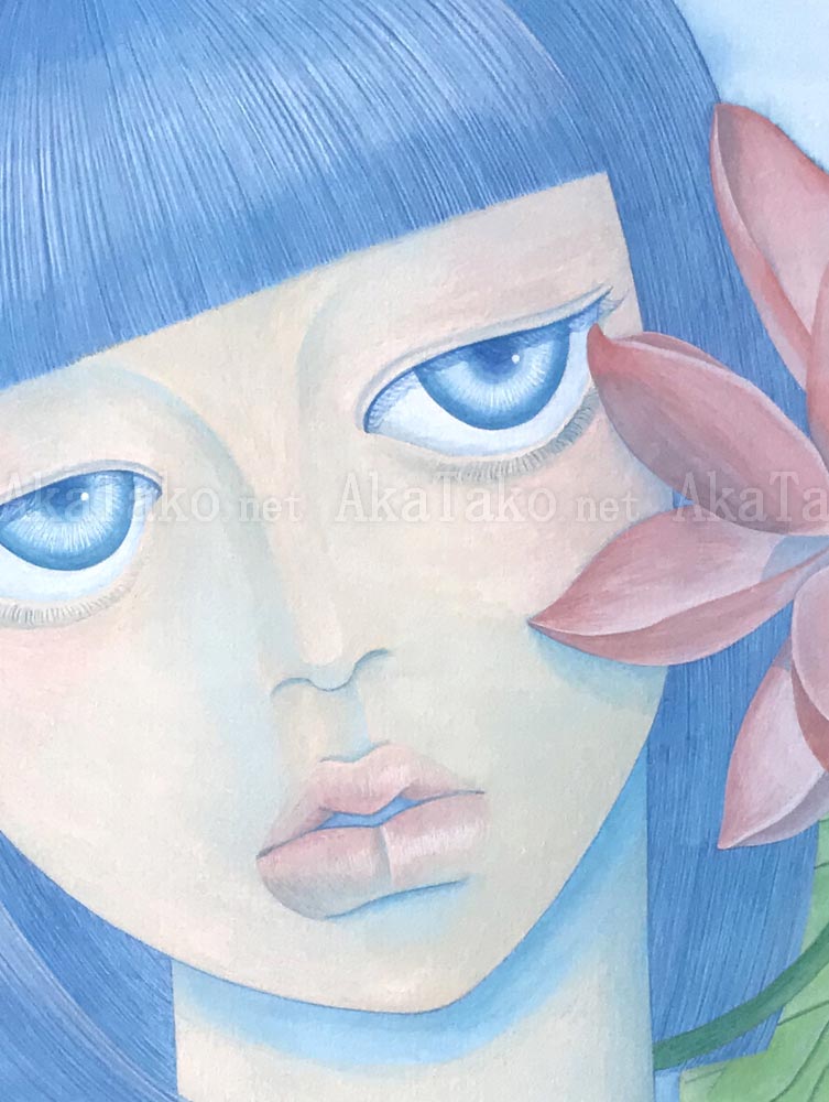 Original painting by Chika Yamada of a blue schoolgirl with an oversized pink lotus blossom blooming near her left ear.
