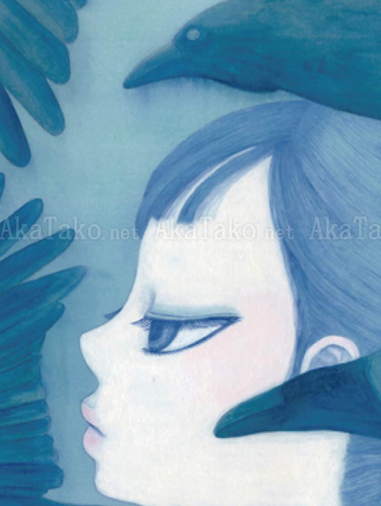 A schoolgirl faces to the left in the midst of a murder of crows. Their flight lifts her uniform in the breeze of their wings. Brand new, original giclée print is hand SIGNED and NUMBERED limited edition of 25 pieces. Was also reproduced in her "Hyou Hyou" book.