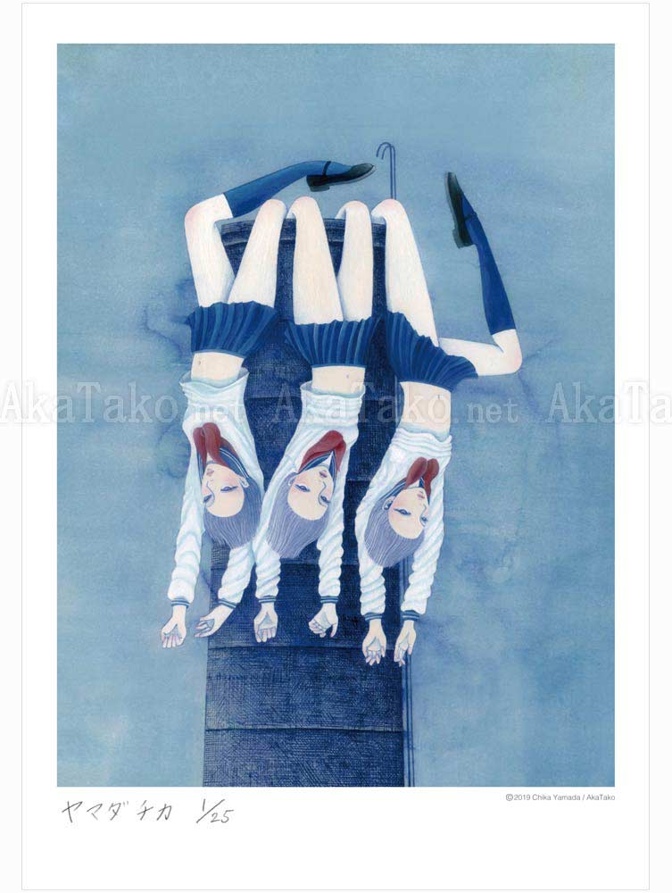 Three schoolgirls hang upside down from the top of a very tall smokestack. A bit of blue haze hangs in the background as their skirts defy gravity. Brand new, original giclée print is hand SIGNED and NUMBERED limited edition of 25 pieces.
