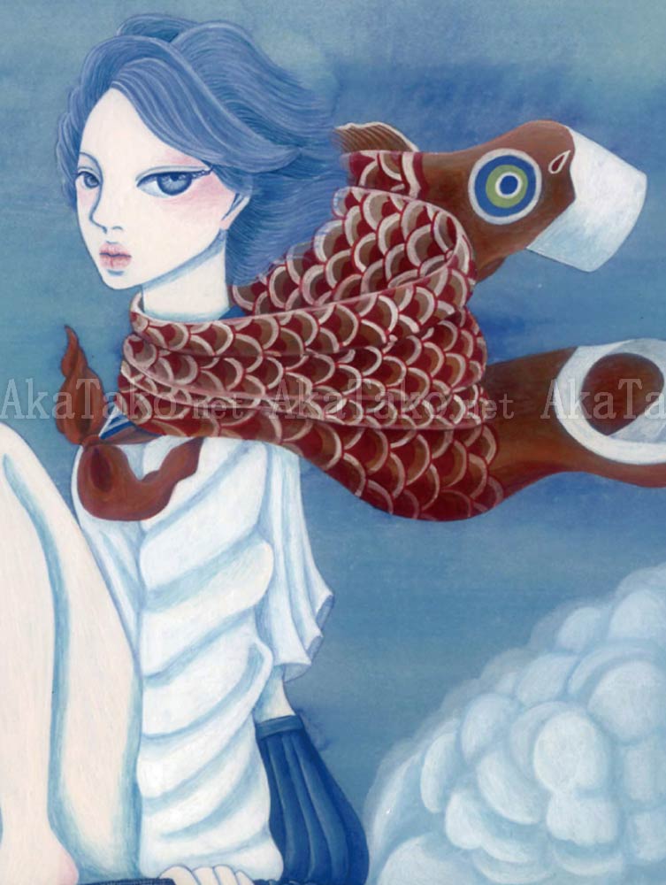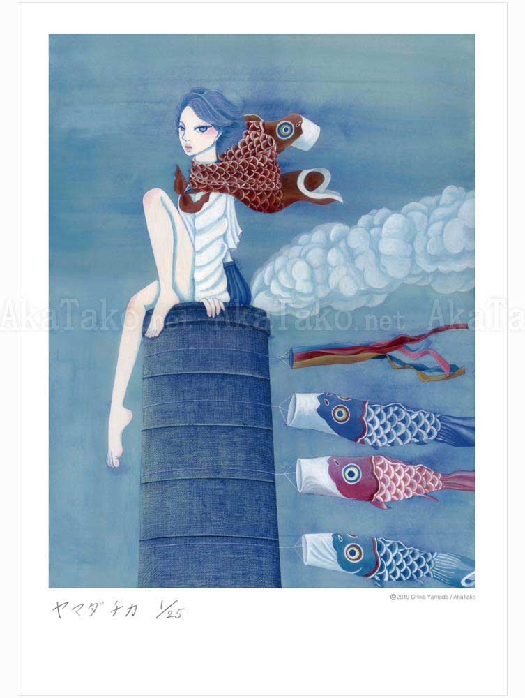 A schoolgirl wears a giant carp as a scarf and smoke billows out from the smokestack she is sitting on. Smaller carp streamers fly in the breeze lower down the chimney. Brand new, original giclée print is hand SIGNED and NUMBERED limited edition of 25 pieces.