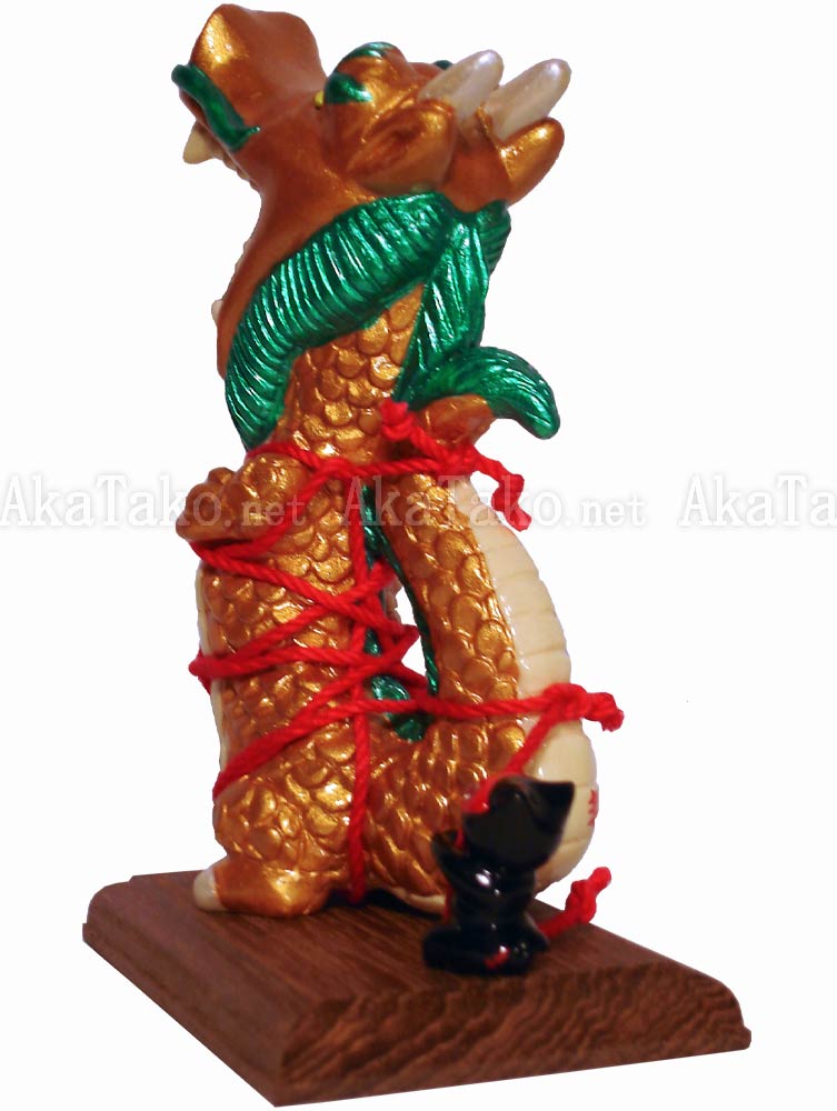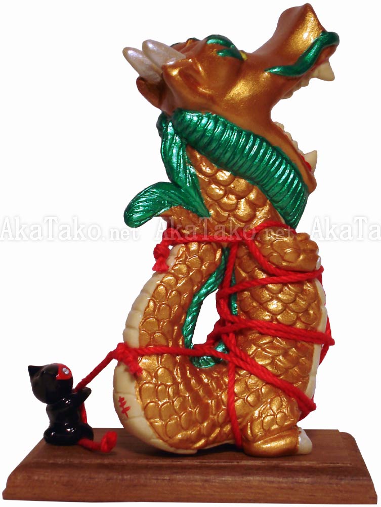 This dragon's scales shimmer with metallic gold paint and a tiny black cat in a red mask tries to rein him in with red rope tied in a karada pattern. Kinbaku doll handmade in Japan and signed by the artist (in red on back). Comes in a colorful cardboard box (shown in second photo). More info on Kitanya.