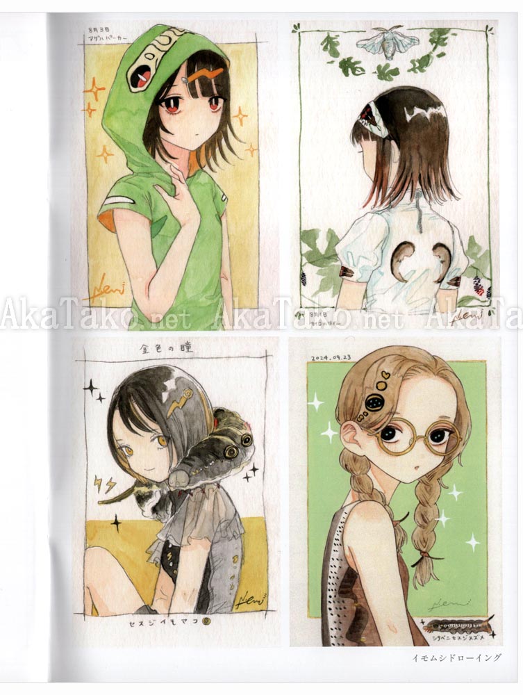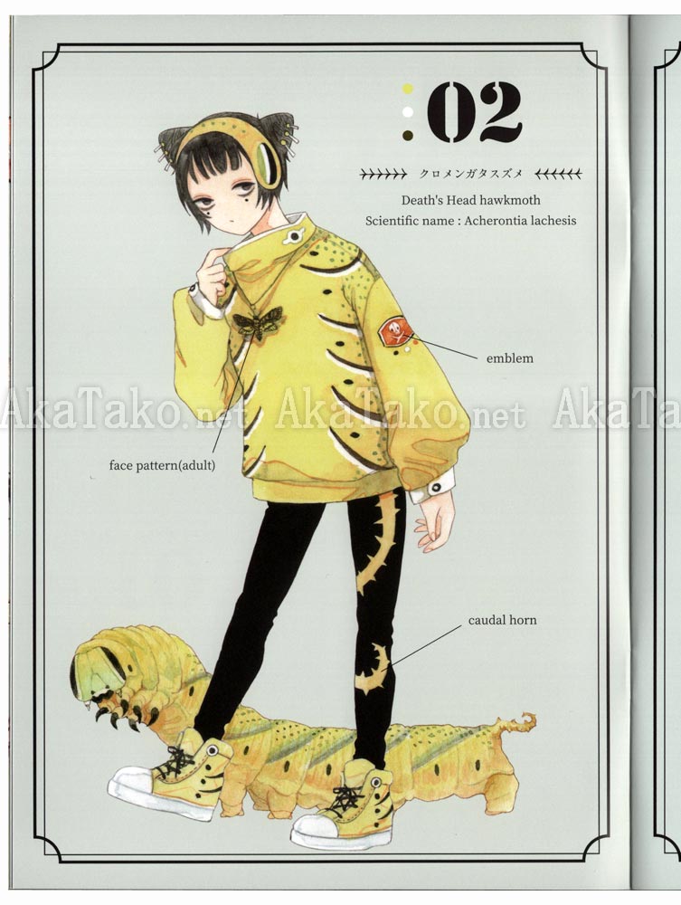 A new volume of cute caterpillar inspired fashions by Em Nishizuka! Transparent watercolor fashion designs are shown alongside an illustration of the caterpillar and their scientific name.