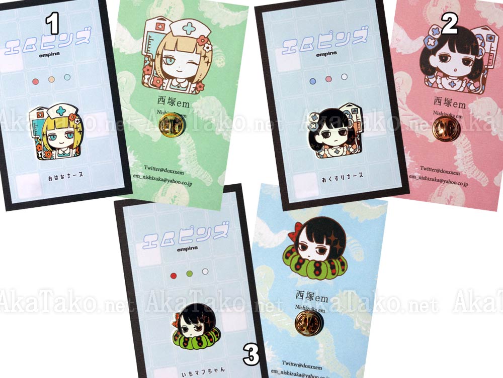 Your choice between three new enamel pins produced by Em Nishizuka. Each comes on its own custom paper backing card as shown in second photo. Quantities are limited. Measurements below are width x height.