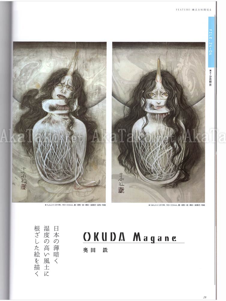 XL size glossy A4 magazine showcases Japanese artists and recent exhibitions. File 24's theme is "A Glimpse of the Profound Mystery" 「幽玄を垣間見る」 with artworks giving a peek at the end, a faint scent of death, the deepness of eternity. Magazine is 95% full color photographs. Text is 100% Japanese.