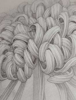 Original artwork by Fuco Ueda is a wonderfully detailed pencil drawing of a chrysanthemum. A tightly curled bunch of petals levitate above long tendrils against a hazy background. Framed in a floating shadow box.