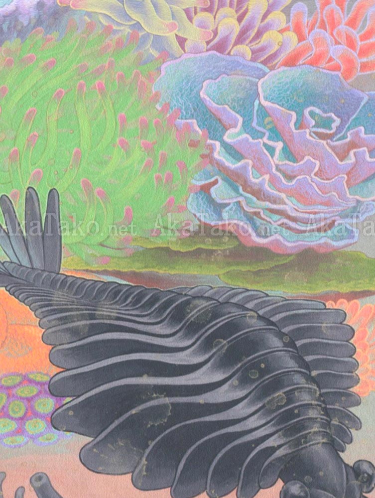 Fine art print of Fuco Ueda's deep sea fantasy "To Fall Asleep". A honey-colored girl reclines amongst colorful corals while somber black creatures pay her a visit with a wish for a good rest.
