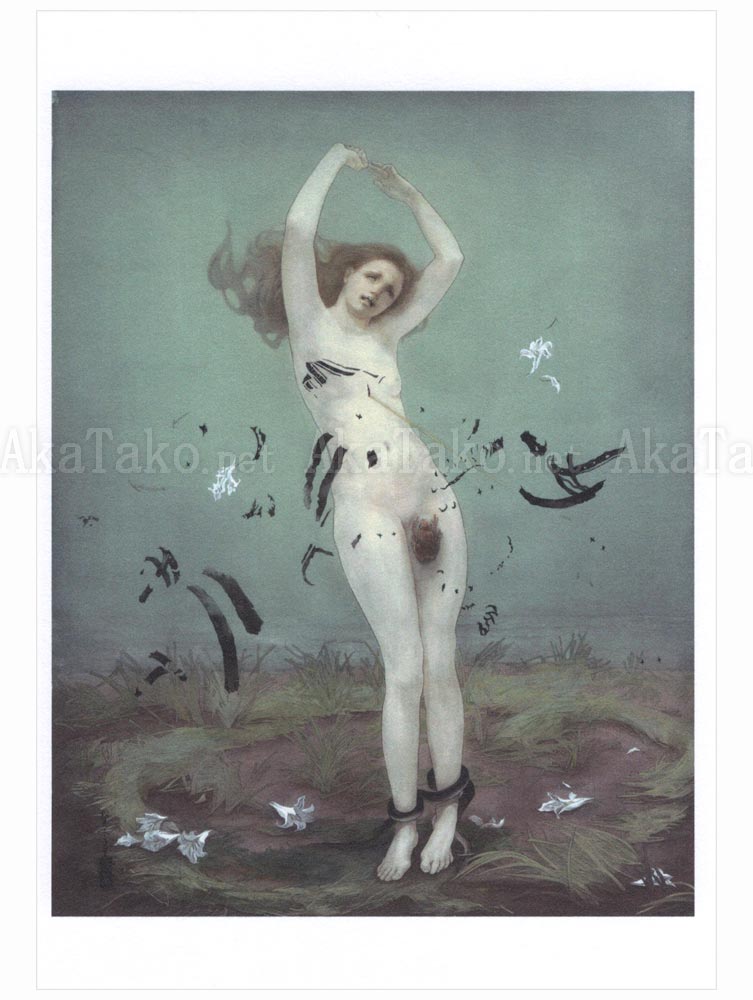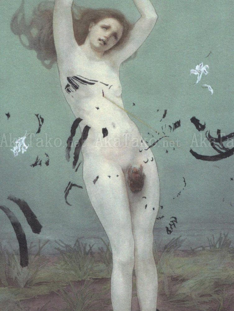 The Observed One - a pale nude woman reaches her hands upwards. A snake is wrapped around her ankles, a large frog sits on her upper thigh, abstract black shapes flutter around her and a thin golden rod pierces her chest.