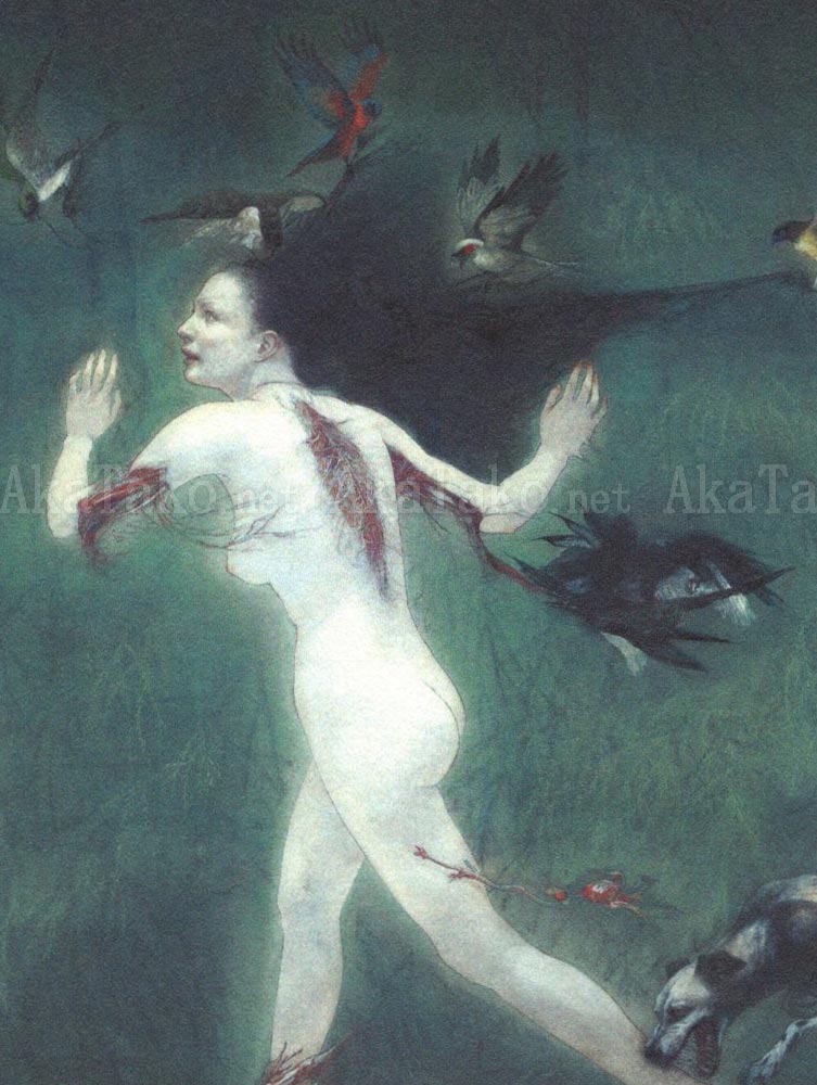 Scattered Deformities in the End - a pale nude woman runs through a dark forest as her body is torn to shreds by attacking birds and a dog biting at her ankle.