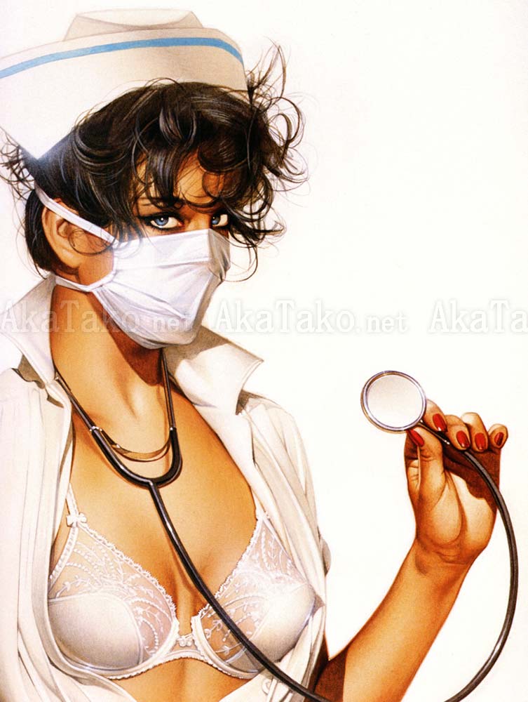 Vintage dead stock oversized print of pin-up artwork by Hajime Sorayama from the 1990s. A brunette nurse wears thigh high stockings and a garter belt under her uniform. She's ready with her stethoscope and face mask but no panties.
