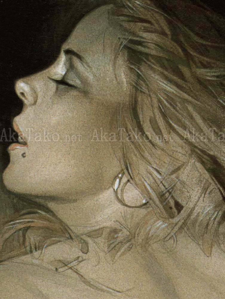 Vintage dead stock oversized print of pin-up artwork by Hajime Sorayama from the 1990s. A nude blonde woman wearing only high heels and some small jewelry glows out of dark black background. She is seen from behind and reaches backwards to play with herself.