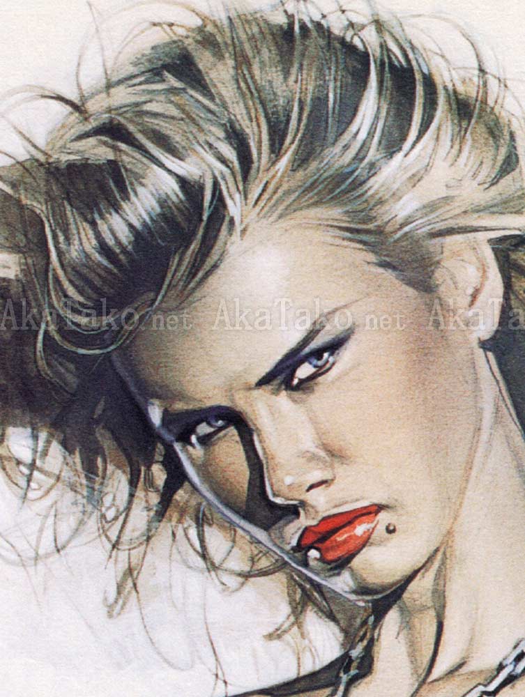 Vintage dead stock oversized print of pin-up artwork by Hajime Sorayama from the 1990s. A blonde woman stands in front of a blue sphere. She wears a black fetish outfit with spikes and knives, a whip tail, and a riding crop in her hand for extra fun. Even her high heeled shooes have shining silver knives on the back!
