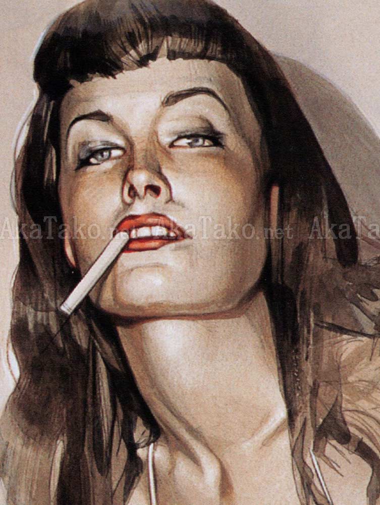 Vintage dead stock oversized print of pin-up Bettie Page with a docile tiger by Hajime Sorayama from the 1990s. She wears a leopard print bikini and black thigh high stockings. She holds a whip in one hand and a cigarette dangles from her mouth. One of her high heels rests on the reclining tiger's exposed crotch.