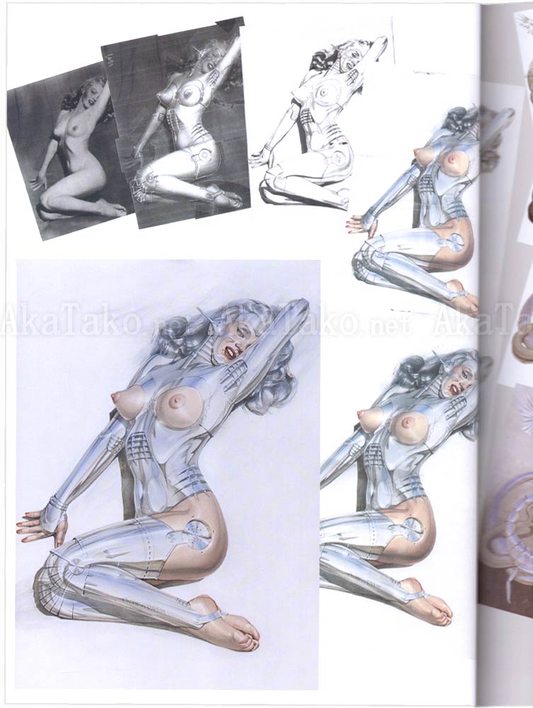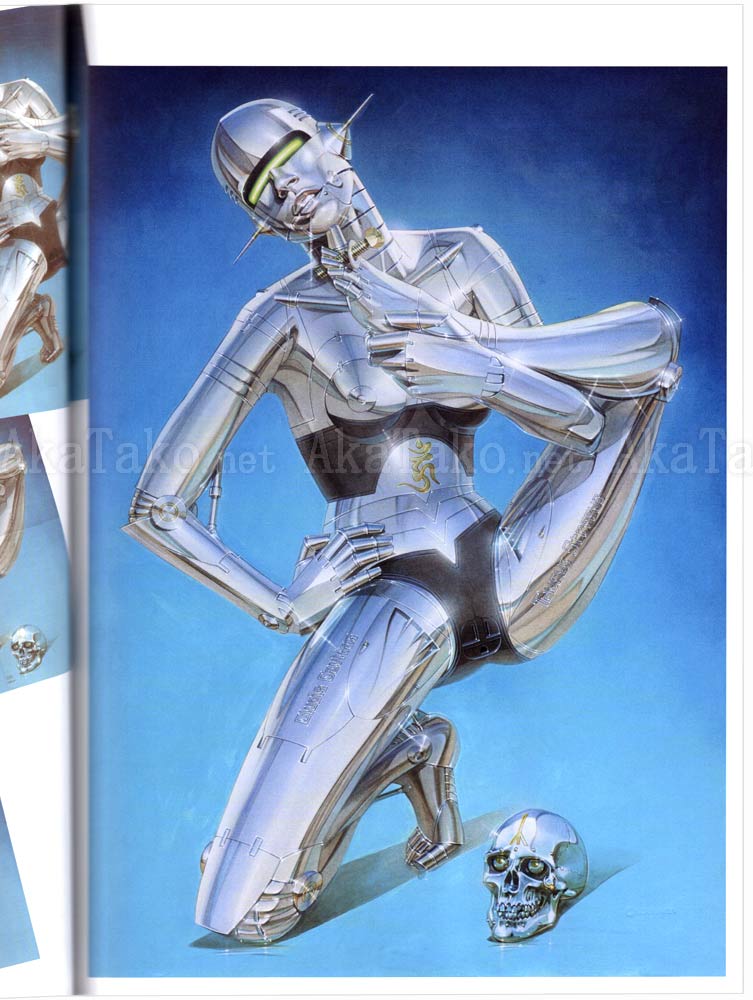 Hajime Sorayama's new catalogue collecting his sexy robot vision taking over the world! Icons and celebrities are given a fresh coat of chrome: Marilyn Monroe, Elvis Presley, Bella Hadid, Kate Moss, Vargas style pin ups, dinosaurs, C3PO and R2D2, Bettie Page, Joan of Arc, Jesus Christ, Statue of Liberty, and even Hitler.