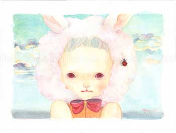 Original painting by Hikari Shimoda of a young girl wearing a fluffy pink bunny hat complete with ears. A lady bug crawls up the left side of her hat. Her eyes are red and she wears an orange top with a big red bow at her neck. SIGNED "Hikari 2010" in pink on the lower right corner.