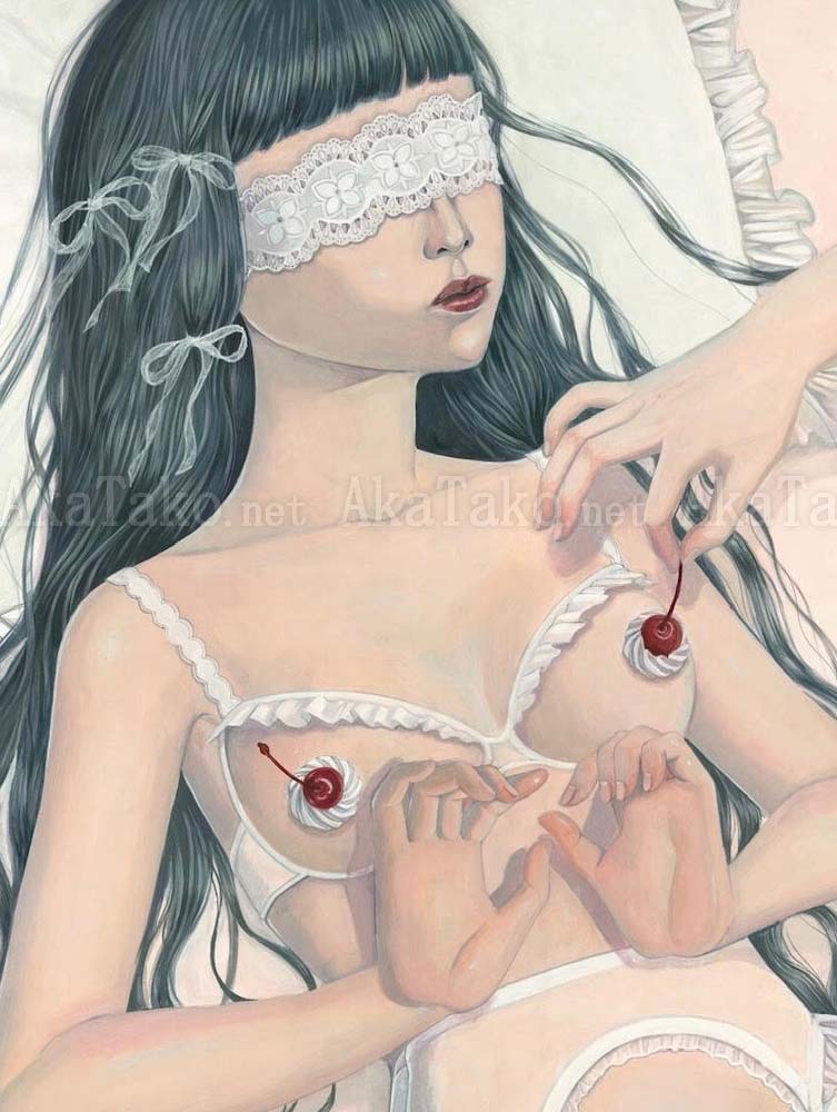 Original painting by Kana Miyamoto of a girl with long black hair wearing delicate white lingerie. A hand reaches in to pluck a cherry resting on whipped cream.