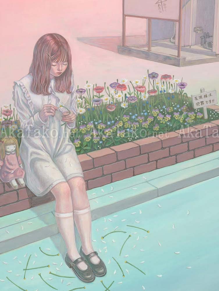 Original painting by Kana Miyamoto of a girl sitting in front of flowers in the park. She plucks off the petals one by one and they drop around her feet. A public toilet is in the background.