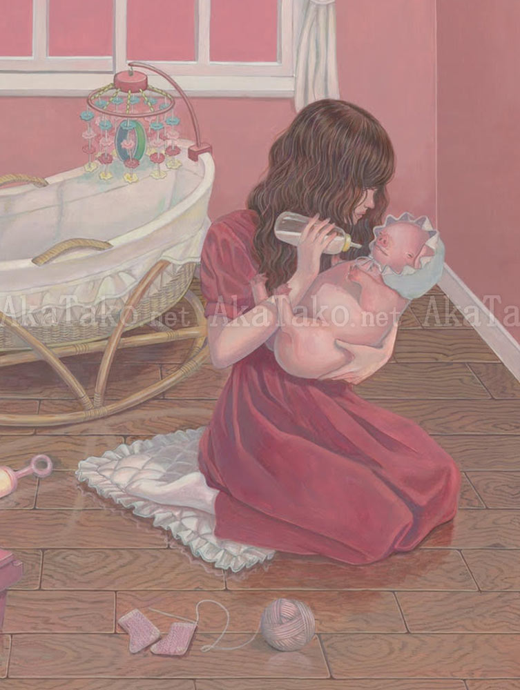 Original painting by Kana Miyamoto of a girl kneeling on a wooden floor in a pink room. She cradles a chubby little pig in her arms and offers it a bottle.