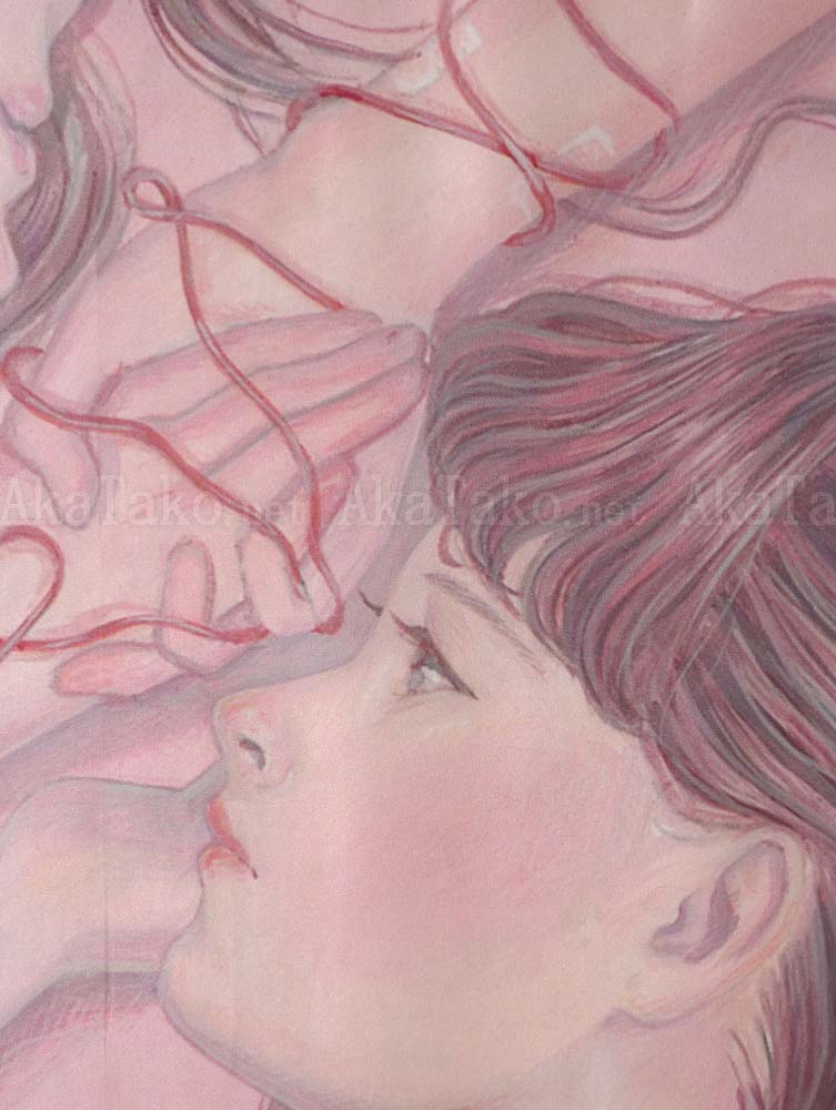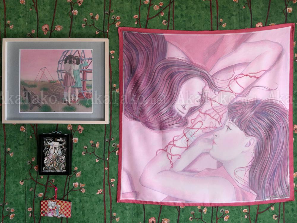Special collaboration between Kana Miyamoto and AkaTako.net ! 100% silk art scarf of Kana Miyamoto's artwork "I am You". Two girls with brown hair lay facing each other in mirrored position. They clasp each other's hands which are wrapped in red tubing and medical bandages.