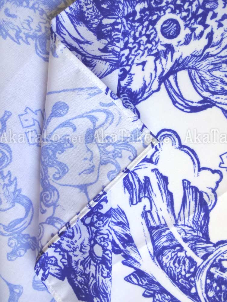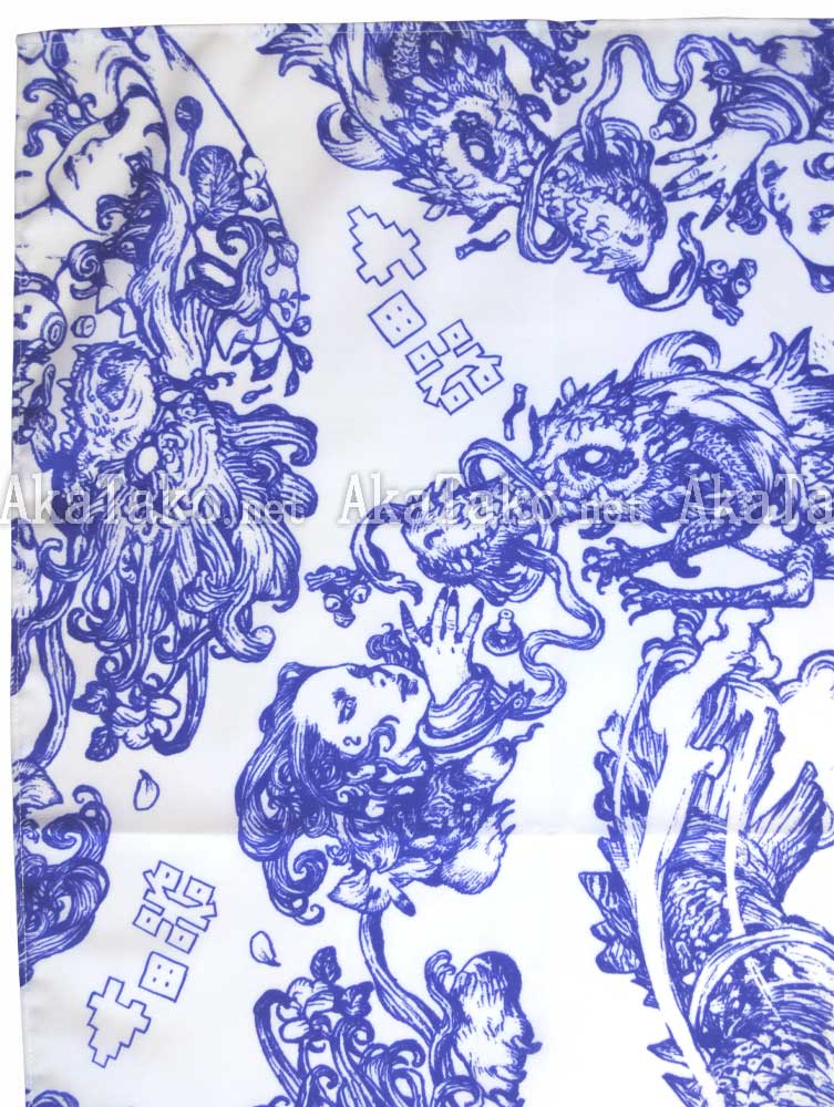 Cotton blend furoshiki (Japanese wrapping cloth) featuring vibrant indigo blue sketch design of Katsuya Terada's work. Dragons fly in a spiral with girls and claws and characters. Katsuya Terada's stylized signature is also featured prominently.