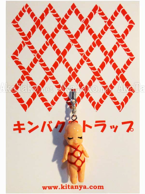 Kewpie doll doesn't mind a little Japanese rope bondage from time to time - as long as it's a pretty karada pattern! Kinbaku cell phone strap handmade in Japan and signed by the artist (in red on back). Comes on a paper display card as shown in second photo and has a lobster claw clasp to make attachment easier.