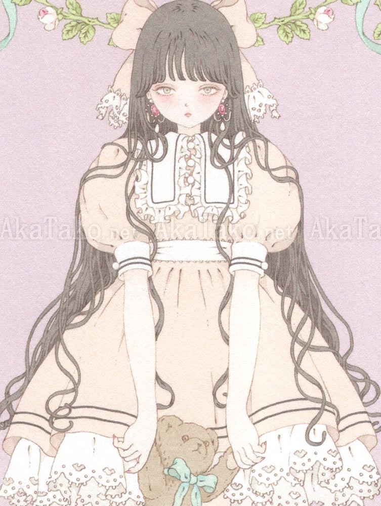Brand new mini poster print by Kira Imai. A girl with long gray hair wears a lovely tan dress over a lacey white petticoat. She holds a teddy bear with a green ribbon in front of her. Lovely border of soft mauve color with light teal ribbons, delicate flowers, and fluted accents.