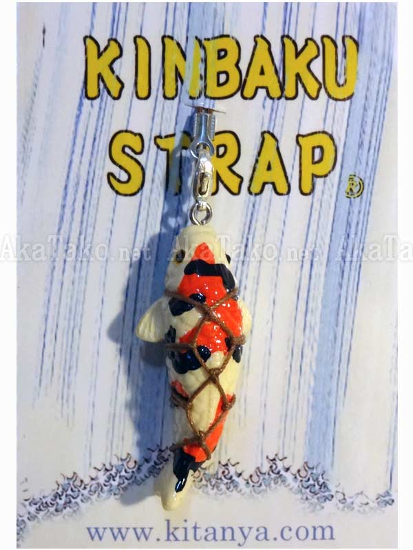 Tri-color koi fish is caught and kept in karada pattern Japanese rope bondage. Kinbaku cell phone strap handmade in Japan and signed by the artist (in red on back). Comes on a paper display card as shown in second photo and has a lobster claw clasp to make attachment easier.