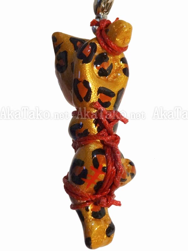 Pretty lady in a metallic gold leopard costume is tied up in red rope and hangs from her hands. Kinbaku cell phone strap handmade in Japan and signed by the artist (in red on back). Comes on a paper display card as shown in second photo and has a lobster claw clasp to make attachment easier.