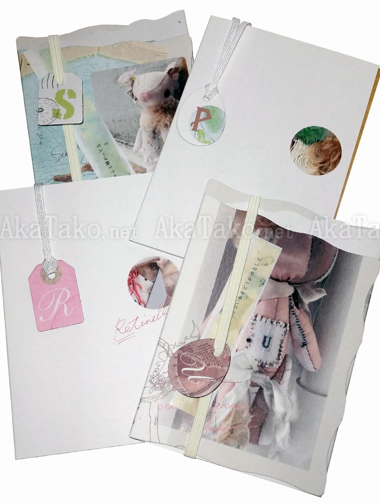 Box contains photographs and sketches of stuffed animals. There are 4 accordian folded cards, 4 eight page booklets, three folded mini-posters, 12 strips of paper with poems written on them, and 12 letter tags on ribbon. Almost all text is Japanese with a few words in English.