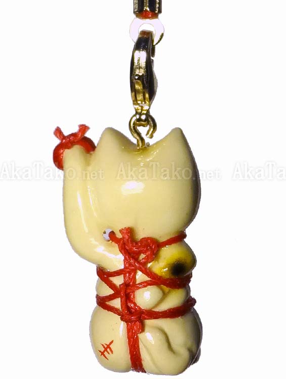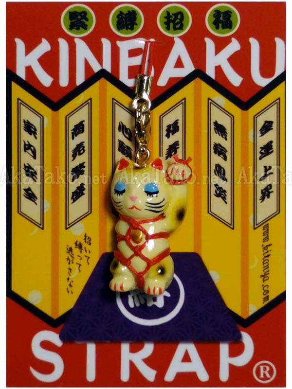 Maneki neko invites good luck your way with his one free hand (the other is tied behind his back). Kinbaku cell phone strap handmade in Japan and signed by the artist (in red on back). Comes on a paper display card as shown in second photo and has a lobster claw clasp to make attachment easier.
