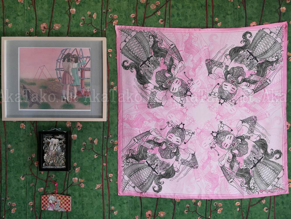 Special collaboration between Makiko Sugawa and AkaTako.net ! 100% silk art scarf of Makiko Sugawa's artwork "Lace-Up Dress". The original black and white drawing of a girl with mechanically attached arms. Her dress is an intricate criss-cross of laces and bows, all the way up to the face cover corset over her mouth! Previously unpublished.