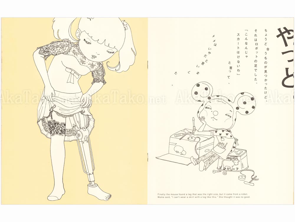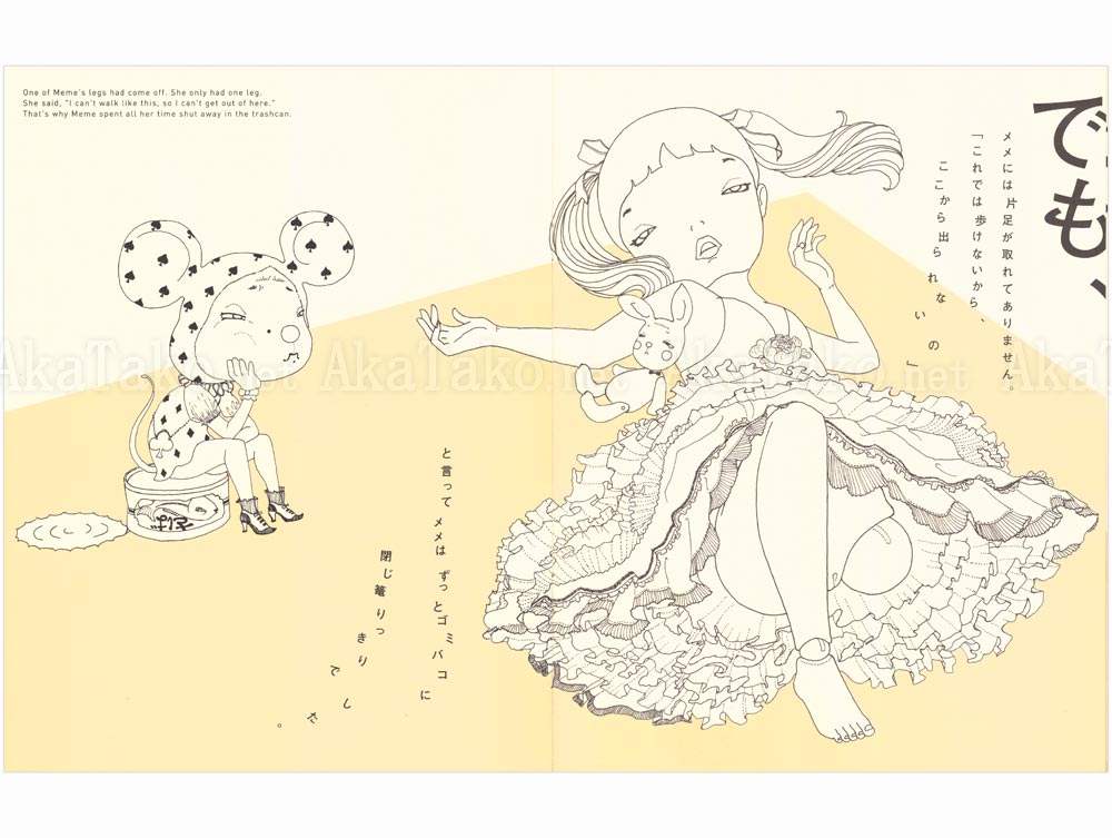 XL size book telling the heartbreaking story of a broken doll Meme who was thrown in the trash because she was missing a leg. Her mouse friend Nii searches through the garbage to try to find her a replacement leg so she can climb out of the trash bin. Eventually Nii finds a robot leg that allows Meme to escape and see the sky again.