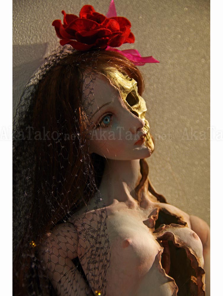 Original, handmade doll by Mari Shimizu of a pale young girl with working ball joints. Her flesh is gone from half her face to reveal her skull and her skin has begun to melt away at her chest exposing ribs and a radiant heart with wings.