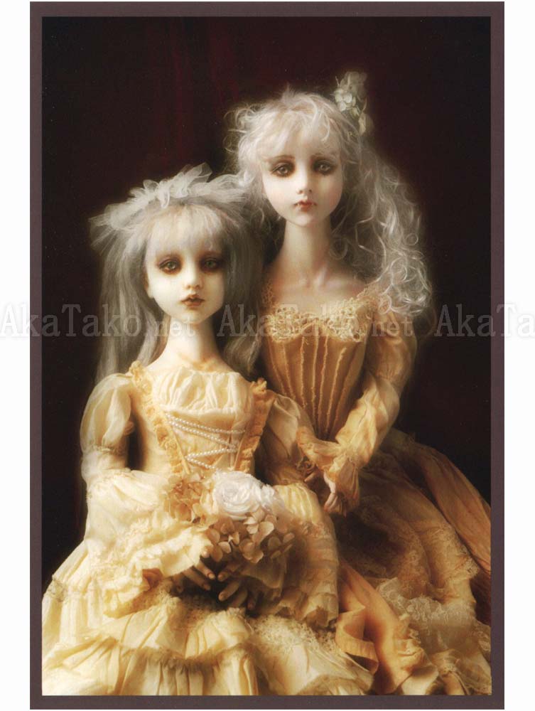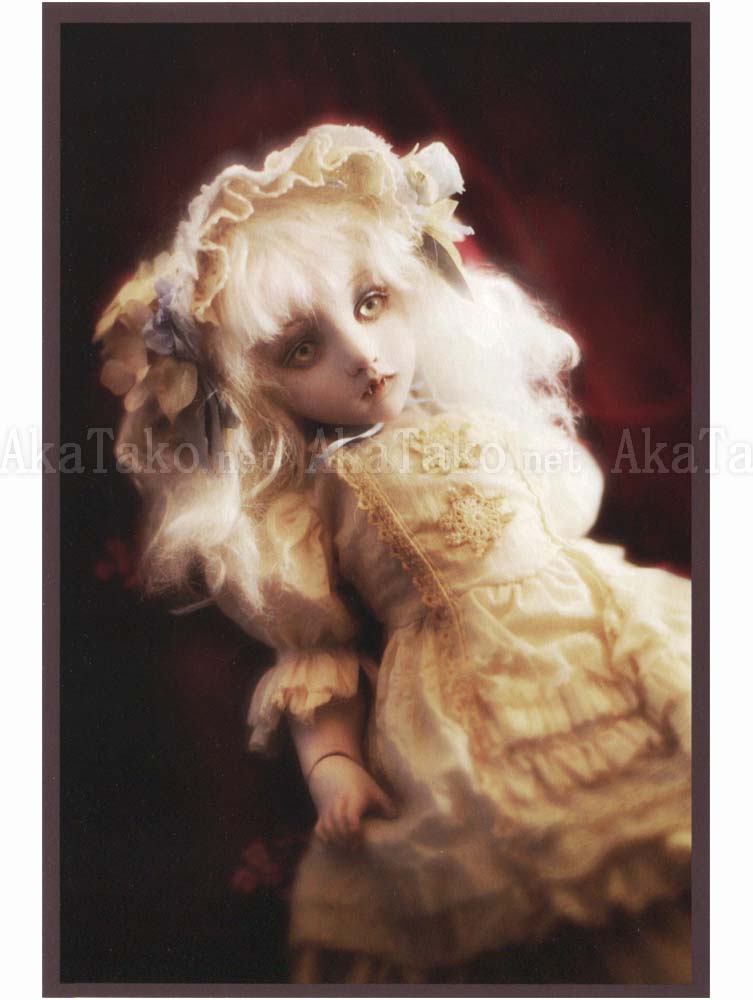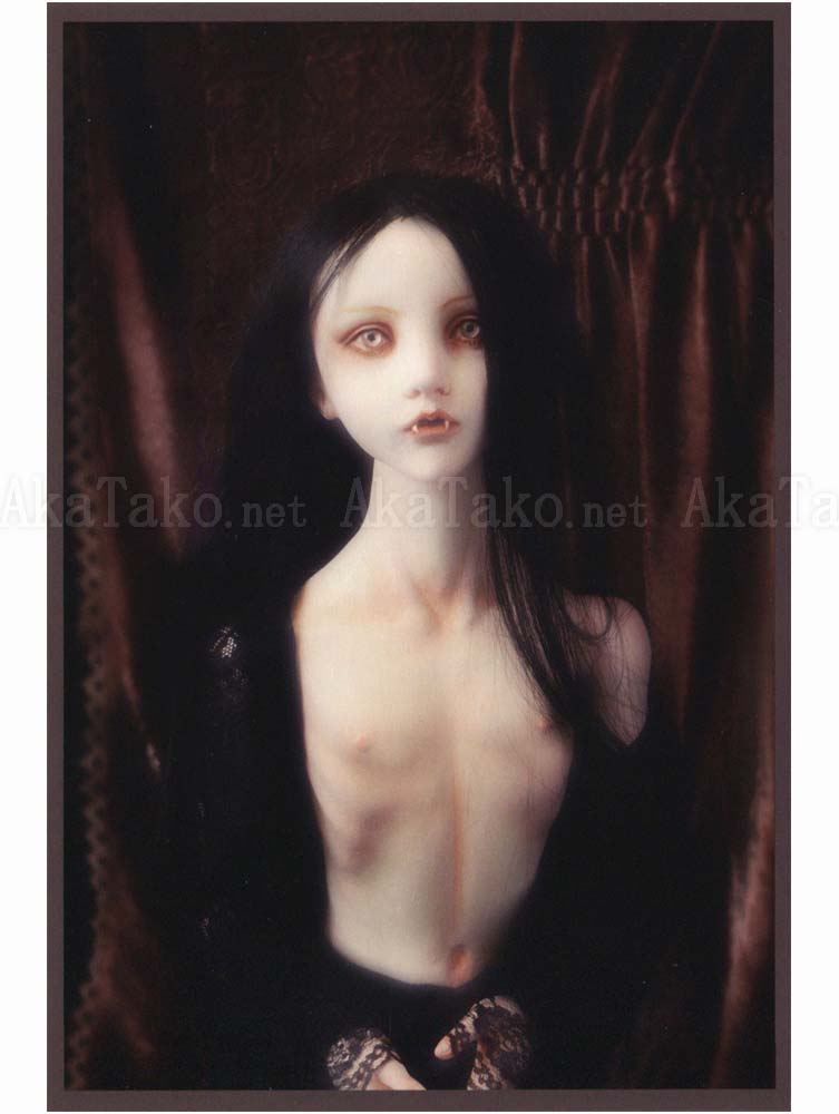 Set of four postcards by Japanese contemporary doll maker Mari Shimizu. Each card features a vampire doll - one a blonde girl in a coffin, two girls in ivory lace with dark sunken eyes, a young girl in a Victorian dress with a matching hat, and a dark haired vampire with an open shirt.