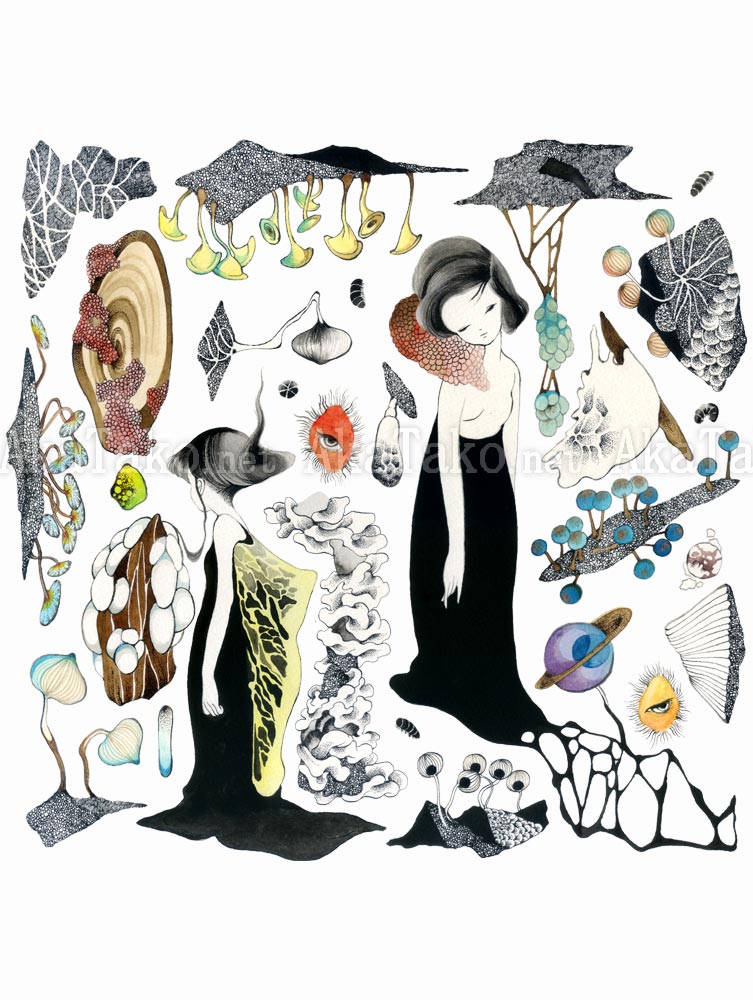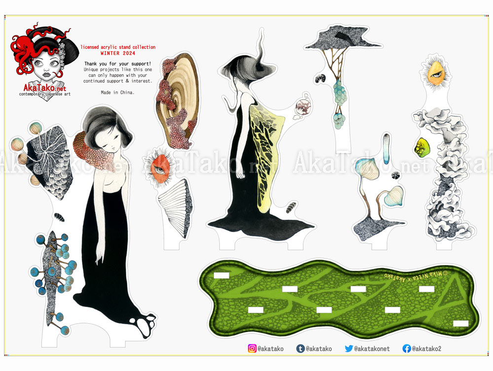 Special collaboration between Mika Nitta and AkaTako.net ! Clear acrylic art stand assembles to display your favorite artwork in a 3D layered form. "Slime Mold" artwork is previously unpublished. A special feature of Mika Nitta's acrylic stand - the pieces can be moved and rearranged on the base however you like! The connections are the same size and spacing so you can change the display many times.