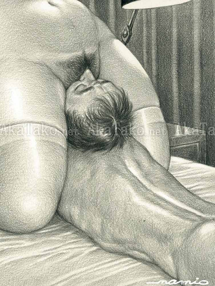 Original drawing by Namio Harukawa of a female nurse with her uniform completely opened down the front. The male patient is tied to the bed frame with rope and his face is firmly fixed in her crotch.