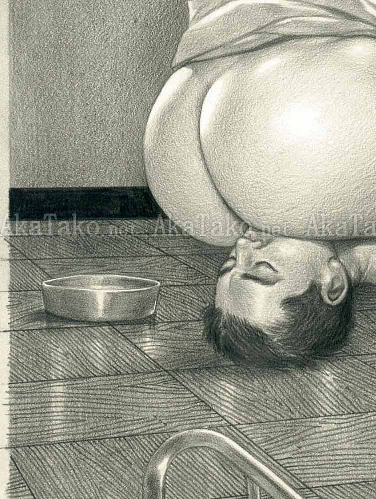 Original drawing by Namio Harukawa of a female nurse crouching over the face of a nude patient laying on the floor. Her uniform is pulled up to her waist and she holds a cup in her hand as he passively lays under her.