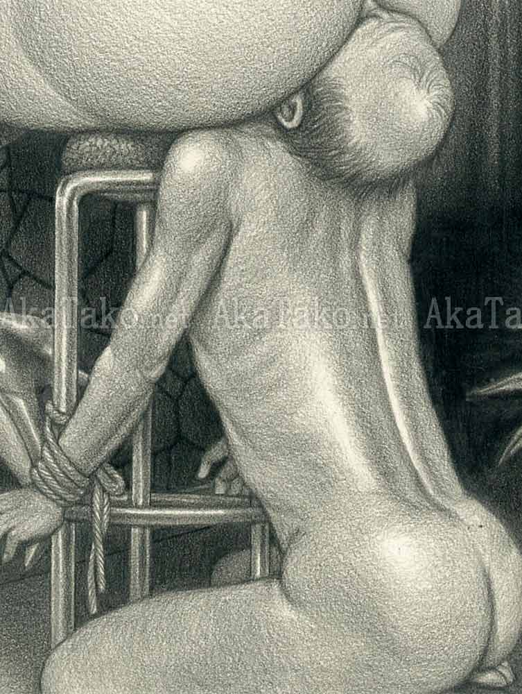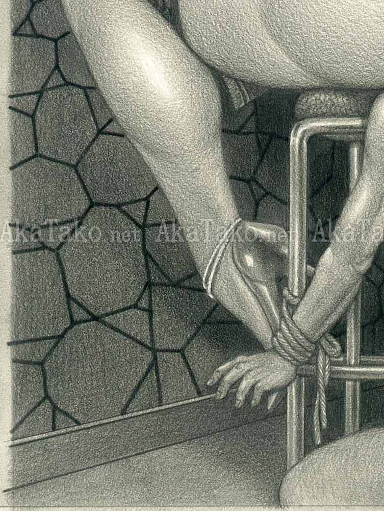 Original drawing by Namio Harukawa of a woman sitting at a bar with her skirt pulled up to her waist. A kneeling nude man is tied to her barstool so his face disappears in her buttocks.
