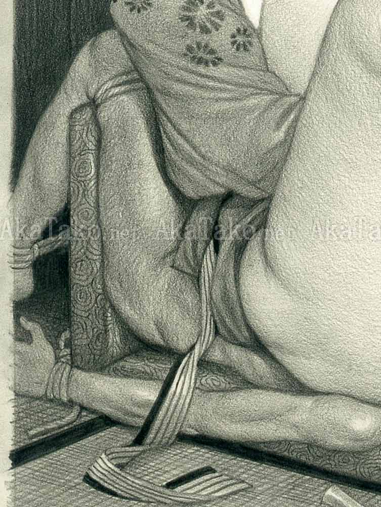 Original drawing by Namio Harukawa features a woman with her kimono on her shoulders. She reclines on a chair with a nude man tied to it so that she may sit on his face.