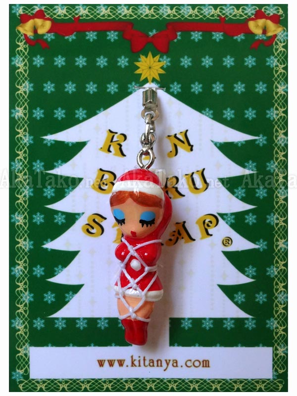 Santa lady kinbaku charm. Kinbaku cell phone strap handmade in Japan and signed by the artist (in white on back). Comes on a paper display card as shown in second photo and has a lobster claw clasp to make attachment easier.