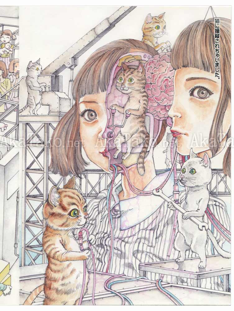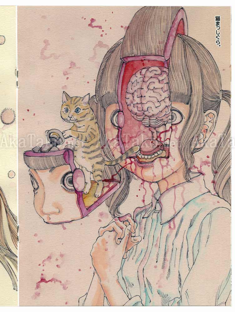 Mini monograph "Cat's Play" featuring Shintaro Kago's ideas of how house cats play with their humans. There's pretty girls bursting with fluffy kitties, cats nibbling on skull contents, cats taking over the inner machinations of their humans, etc.