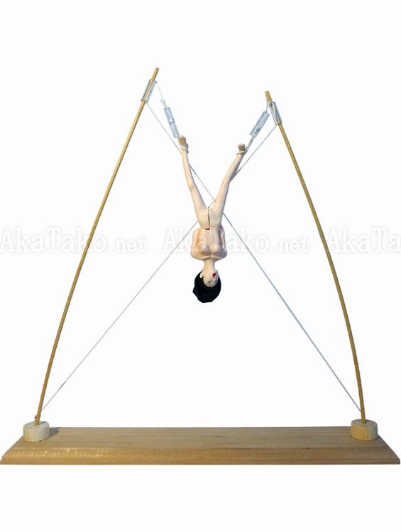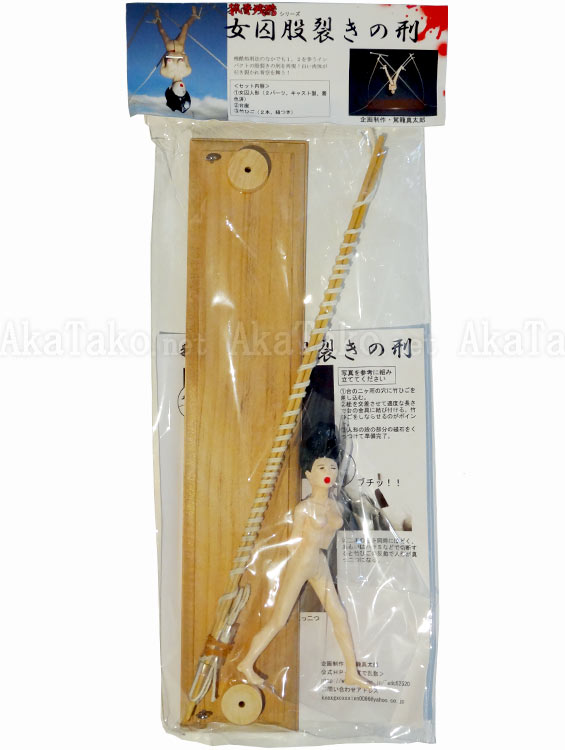 Handmade toy by Shintaro Kago. Full kit to make a suspended scene of a female prisoner experiencing classic Japanese torture - she is hung upside down from her ankles until she is split apart. Includes built in magnets so that you can attach and reattach her legs + instructions (in Japanese with photos).