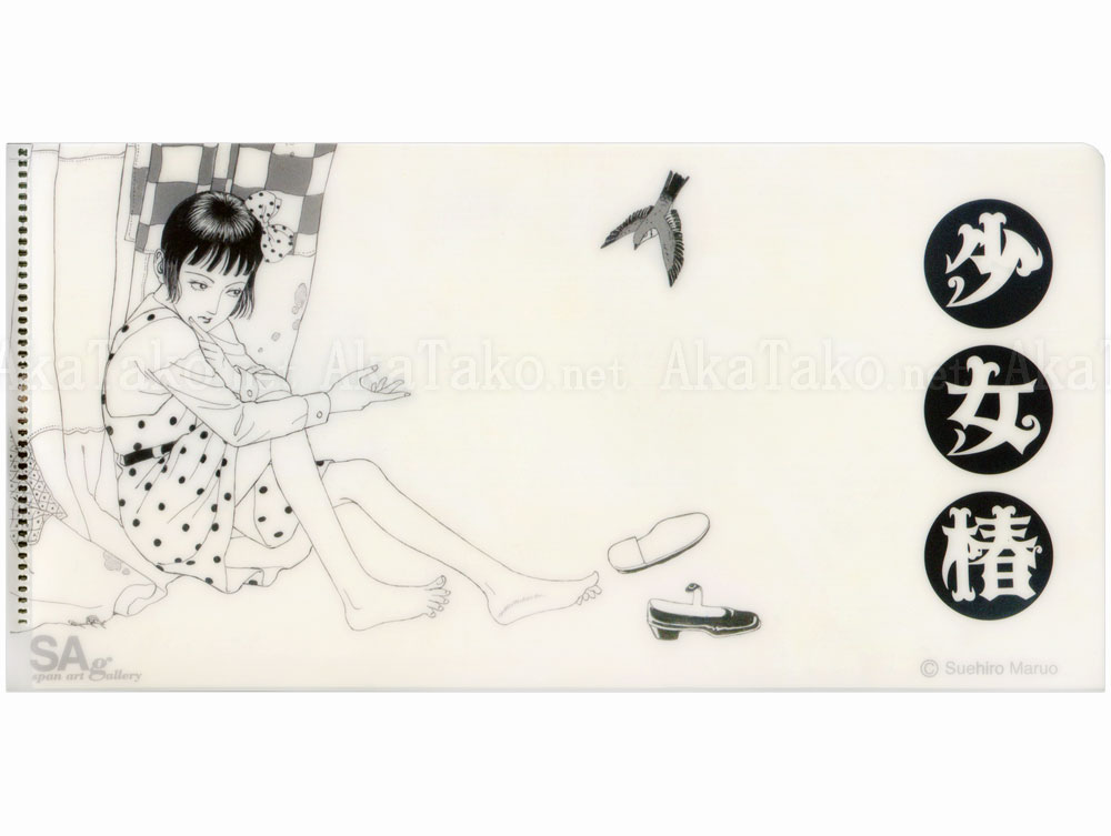 Small size clear folder designed to fit a standard A4 sheet of paper folded into thirds (or paper currency or other documents) features Suehiro Maruo's Little Camellia Girl - Midori. Her red shoes have been kicked off and she sits barefoot in her yellow and red polka dot dress, holding her hand out towards a bird. Monochrome version on reverse.