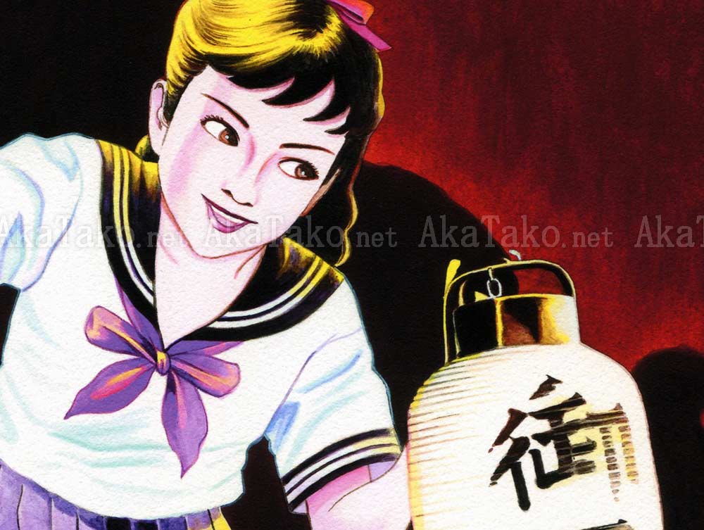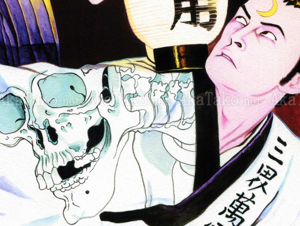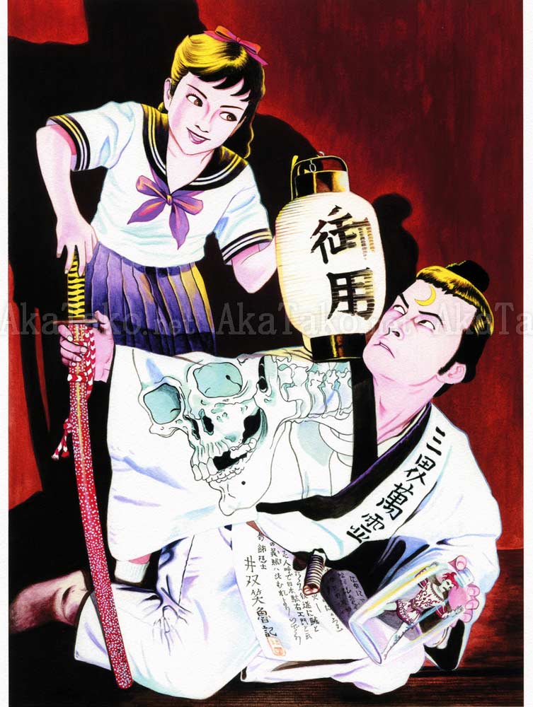 Giclée print of an illustration by Suehiro Maruo for the front cover of the manga "Yume no Q-Saku". A school girl in uniform leans over a samurai on his knees. His kimono has a large skeleton design on it and he holds his sword at arms length. His other hand holds a jar with a figure in it. The school girl holds a paper lantern hear his face and large shadows loom on the red wall behind them.