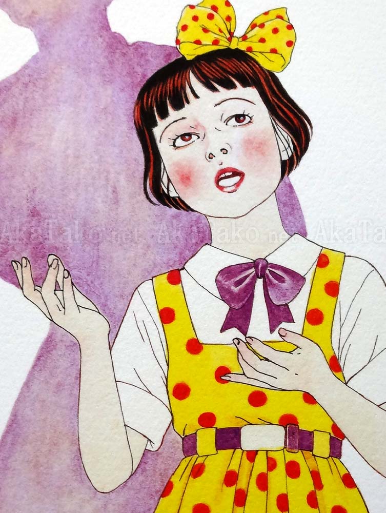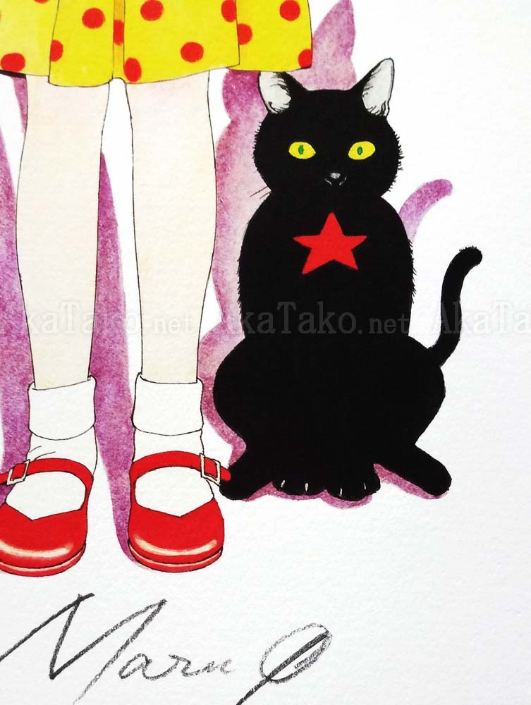 Giclée print of an illustration by Suehiro Maruo of Midori from "Shoujo Tsubaki". Midori stands front and center in her yellow dress with red polka dots. Her purple tinted shadow looms behind her while a black cat with a red star on its chest sits by her feet.