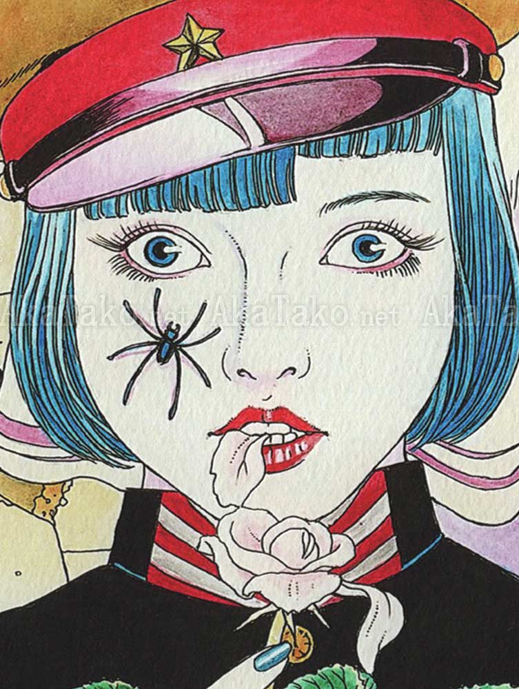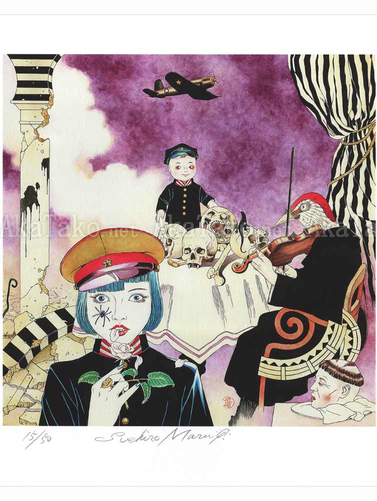 Giclée print of an illustration by Suehiro Maruo for Necronomidol's "VOIDHYMN" CD Jacket. A girl with blue hair nibbles on a flower as a spider rests on her cheek. A little boy plays with skulls and bones on a table top and a bird-faced figure plays the violin with a severed head at their feet.