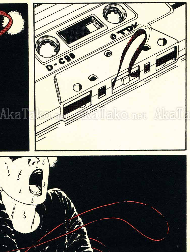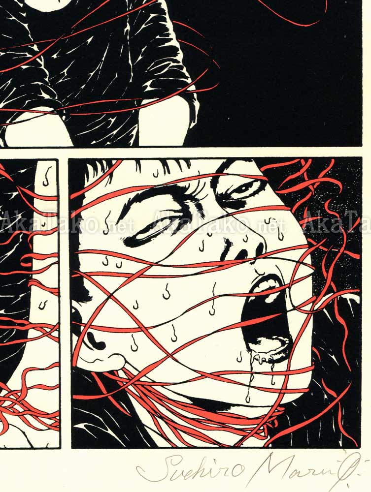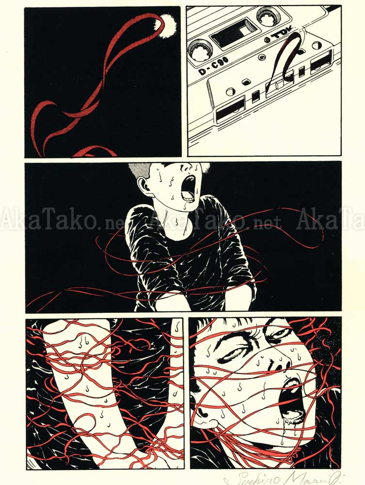 Oversized art print "Electric Ants" of a manga page by Suehiro Maruo which was originally printed in "New National Kid". A thin ribbon of tape snakes out of the cassette and quickly swirls around a terrified boy. SIGNED in pencil. Limited edition of 10. Black and vermillion red printed on very heavyweight off-white/natural paper.