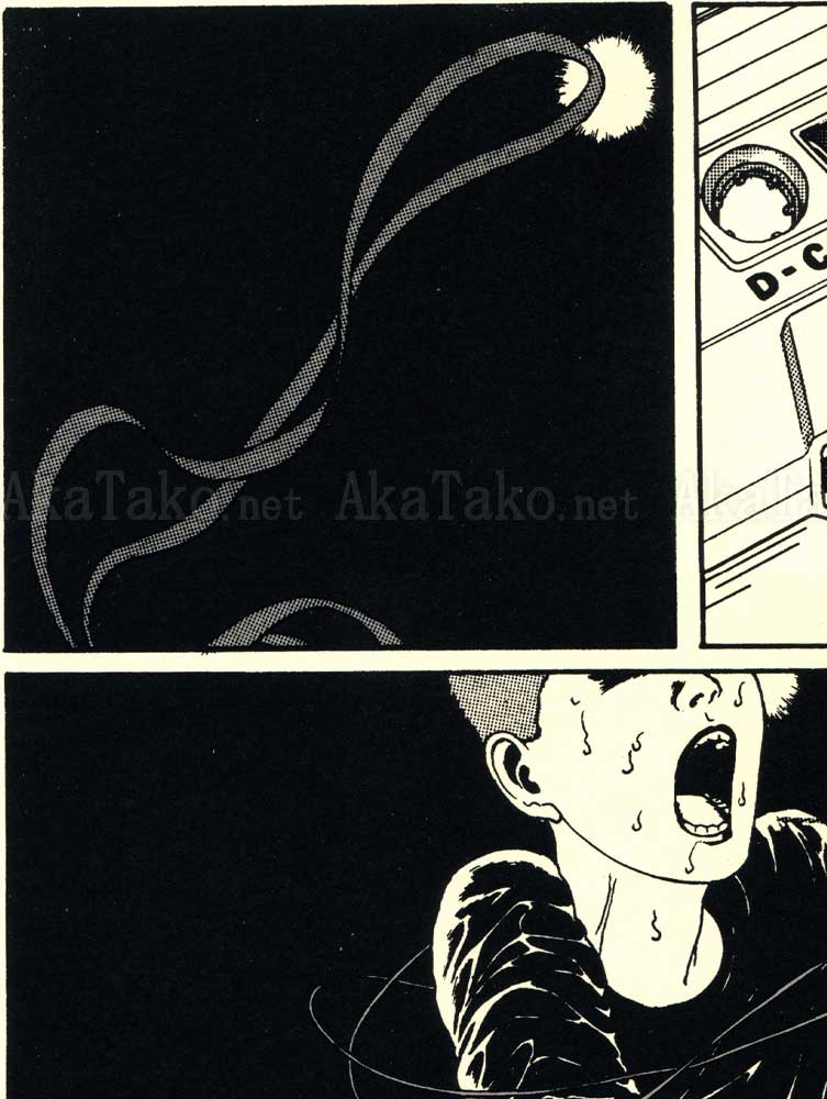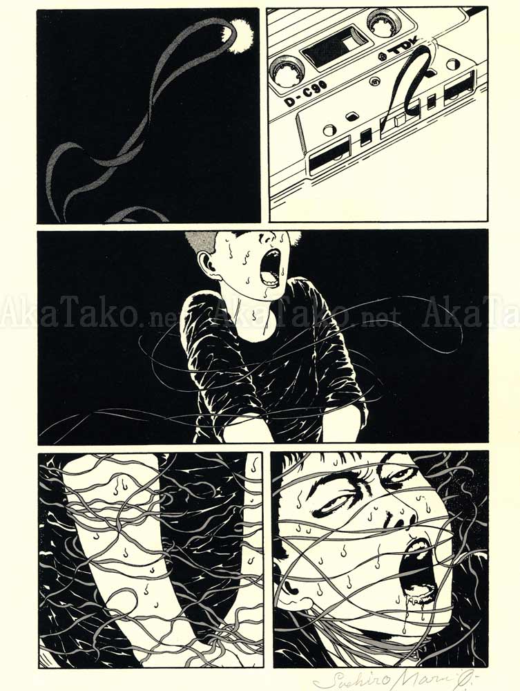 Oversized art print "Electric Ants" of a manga page by Suehiro Maruo which was originally printed in "New National Kid". A thin ribbon of tape snakes out of the cassette and quickly swirls around a terrified boy. SIGNED in pencil. Limited edition of 10. Monochrome tones printed on very heavyweight off-white/natural paper.